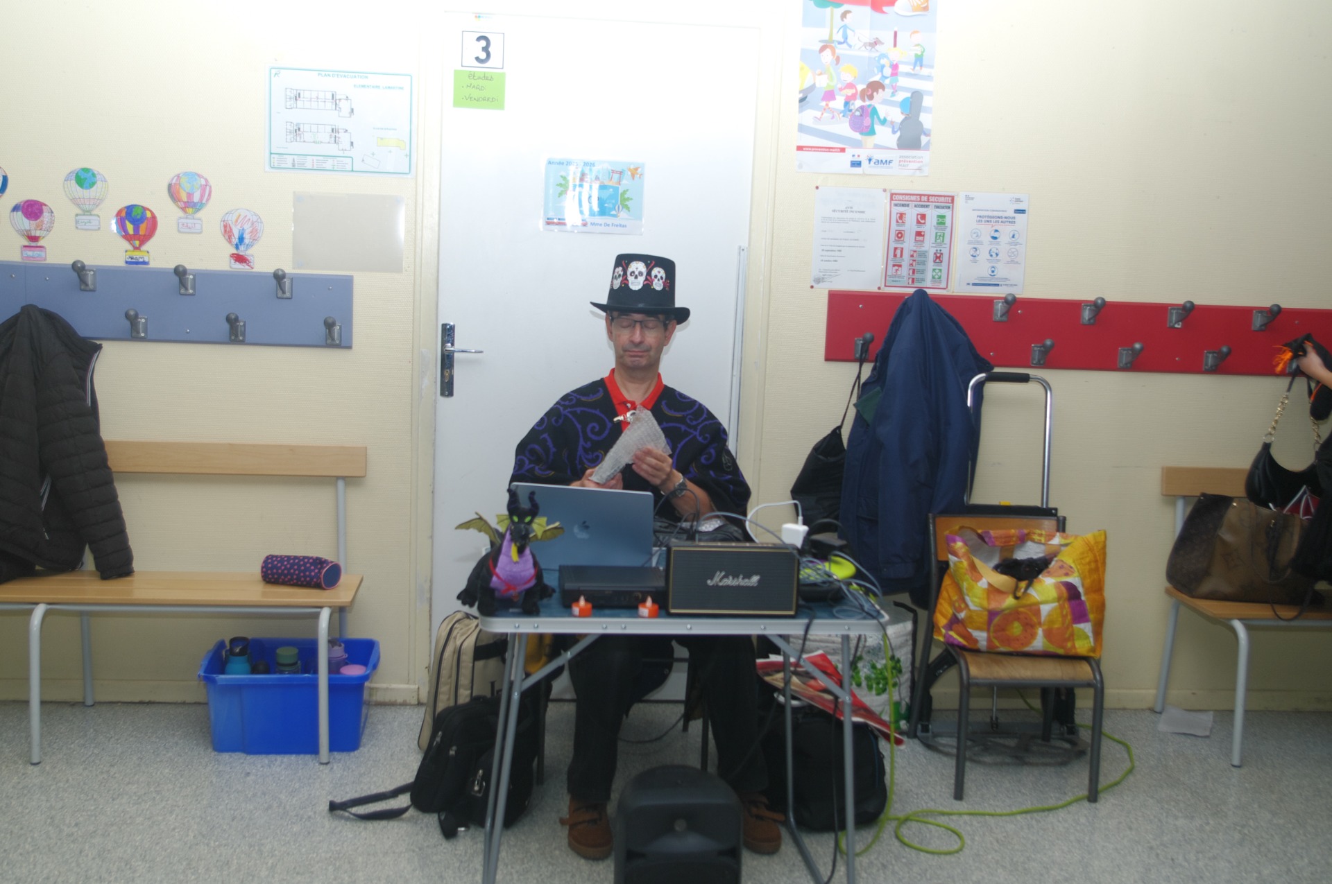 Roland a déjà préparé toutes ses musiques; Il n'a plus qu'à installer son ordinateur.